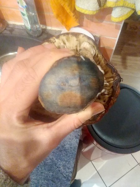 Un bleuissement aussi intense pour un Leccinum m'étonne tout comme le diamètre au sommet du pied .Je commence à douter que cette "chose bleue" prise pour une coupe longitudinale visible sur la cinquième photo sous le pouce,,fasse partie du pied ?