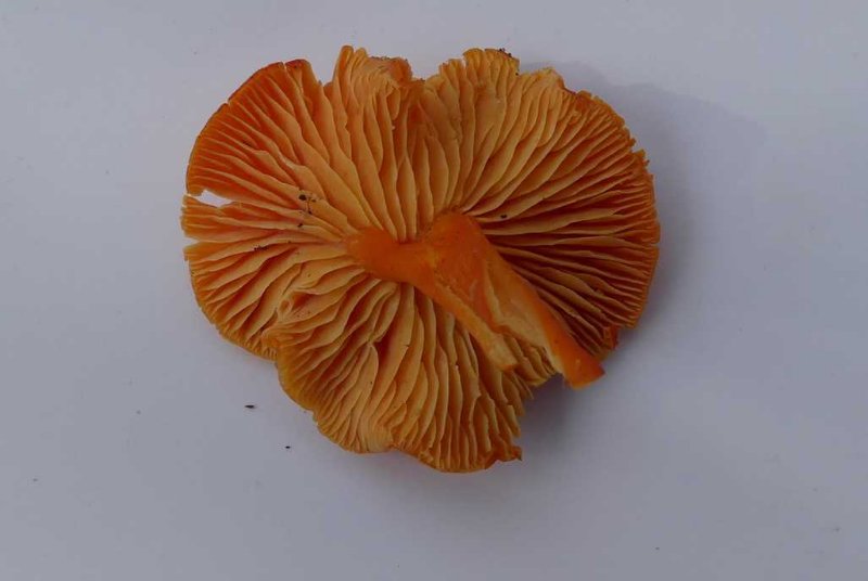 Hygrocybe cantharellus possède des lames nettement décurrentes et surtout espacées.