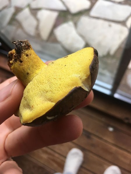 Il me semble qu'il s'agit d'un bolet mais en regardant des photos sur le net j'ai du mal à savoir lequel. Vous le mangeriez vous ?