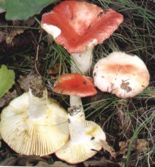 Russule Jolie ou Russula lepida ou rosacea Russule Emétique ou Russula emetica Russule Jaunissante ou Russula luteotacta Russule Amoenlens